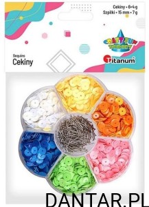 Cekiny ozdobne Titanum 7 mm w mixie kolorów z zestawem szpilek do dekoracji styropianu i prac kreatywnych. Opakowanie 4 g. Cena za 1 opakowanie.