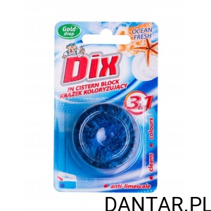 Dix krążek koloryzujący do WC Krążek koloryzujący z serii DIX posiada wyjątkowe właściwości czyszczące. W doskonały i precyzyjny sposób zapobiega odkładaniu się kamienia. Po spłukaniu wody daje obfitą pianę oraz barwi wodę na intensywny zielony lub niebieski kolor.