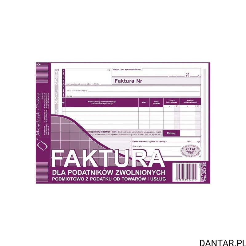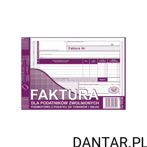 Faktura dla podatników zwolnionych podmiotowo z podatku od towarów i usług. zastosowanie: faktury i inne dokumenty wynikające z przepisów o podatku od towarów i usług. oprawa: bloczek 80 kartek rodzaj papieru: samokopiujący druk: jednostronny