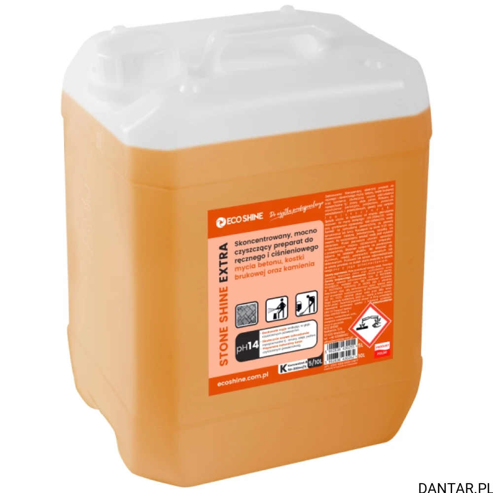 Środek silnie alkaliczny do czyszczenia twardych powierzchni; etykieta produktu wskazuje pH 14 i oznaczenia żrące. Stosować rękawice ochronne i ochronę oczu, nie mieszać z innymi preparatami, unikać kontaktu ze skórą i oczami. Przechowywać w zamkniętym opakowaniu, poza zasięgiem dzieci. Karta charakterystyki Stone Shine Extra jest dostępna u producenta/dystrybutora.