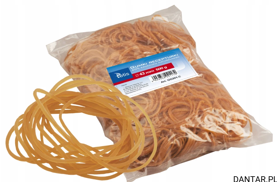 Szukasz solidnych i trwałych gumek recepturek, które sprostają codziennym wyzwaniom w domu, biurze czy magazynie? Gumka recepturka 500g 43mm Tetis to produkt najwyższej jakości, wykonany z elastycznego i odpornego na rozciąganie materiału, który gwarantuje długotrwałe użytkowanie bez ryzyka pęknięcia. Idealna do pakowania, spinania dokumentów, zabezpieczania drobnych przedmiotów czy organizowania kabli.