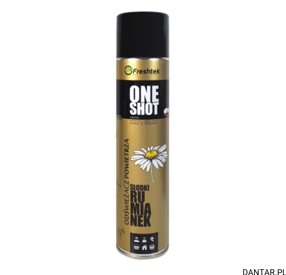 Freshtek ONE SHOT Słodki Rumianek to silnie skoncentrowany odświeżacz powietrza w aerozolu, który błyskawicznie neutralizuje nieprzyjemne zapachy i pozostawia długotrwały, świeży aromat rumianku. Jedno naciśnięcie wystarcza, aby zapach rozprzestrzenił się w pomieszczeniu do 200 m³.