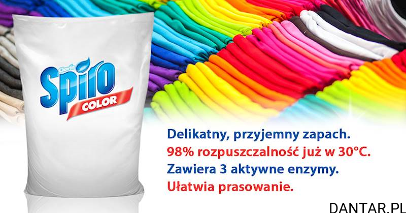 SPIRO Color pierze skutecznie już w temperaturze 30°C, jednak cechą wyróżniającą go na rynku jest 95% rozpuszczalna i bardzo niski poziom inkrustacji, czyli pozostawania proszku na tkaninach.