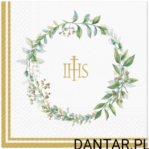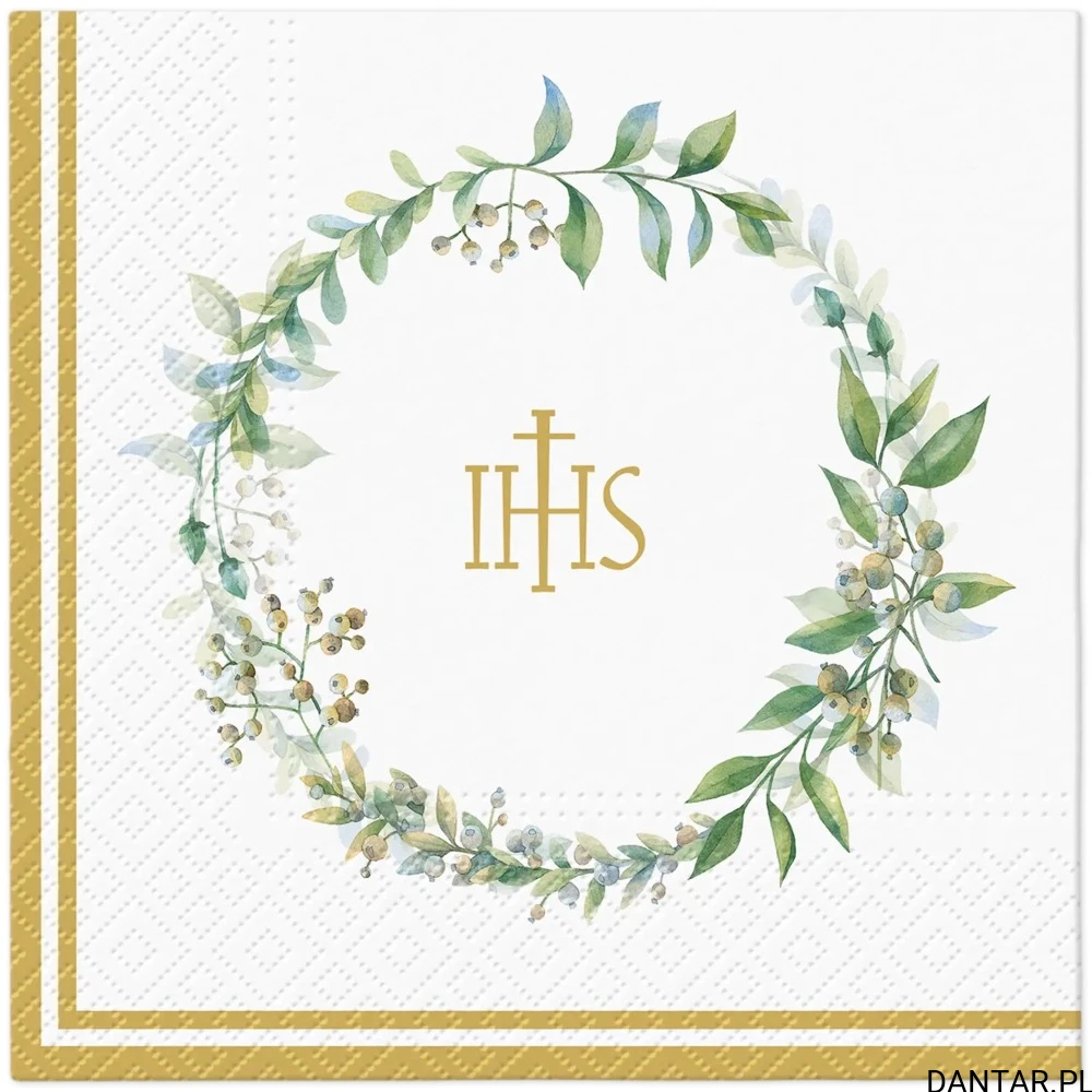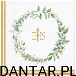 Serwetki komunijne PAW 33x33 cm, 20 szt. Cena za 1 opakowanie. Elegancki wzór IHS do dekoracji stołu na przyjęcie komunijne i słodki stół.